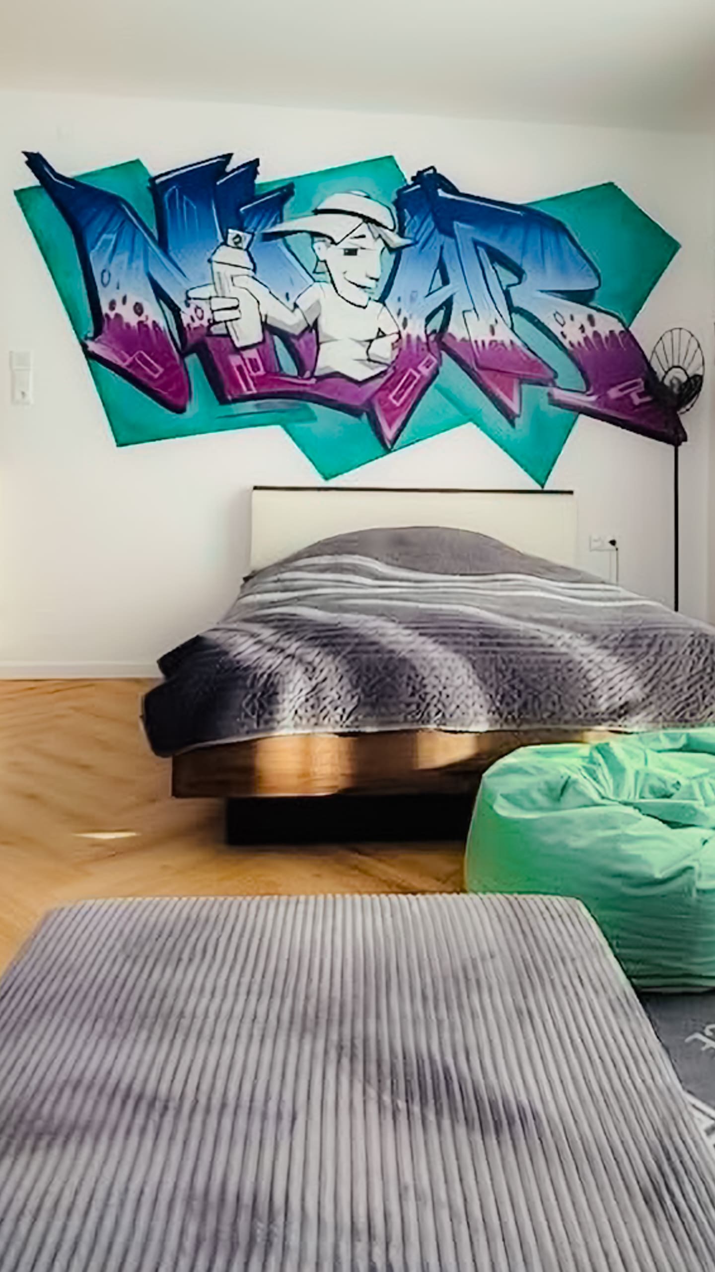 Umziehen ist oft nicht so einfach, vor allem als Jugendlicher; ein neues Zuhause, ein neues Umfeld. Da ist ein Graffiti für das Jugendzimmer natürlich was ganz Besonderes und macht Vorfreude auf das neue Heim! Bunt, cool und ganz persönlich. Die Farben wurden vom jungen Bewohner ausgesucht, der selbst ein großer Graffiti-Fan ist.