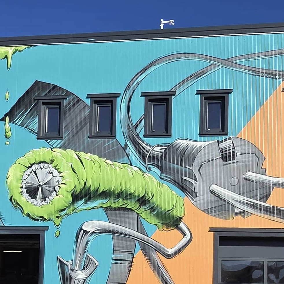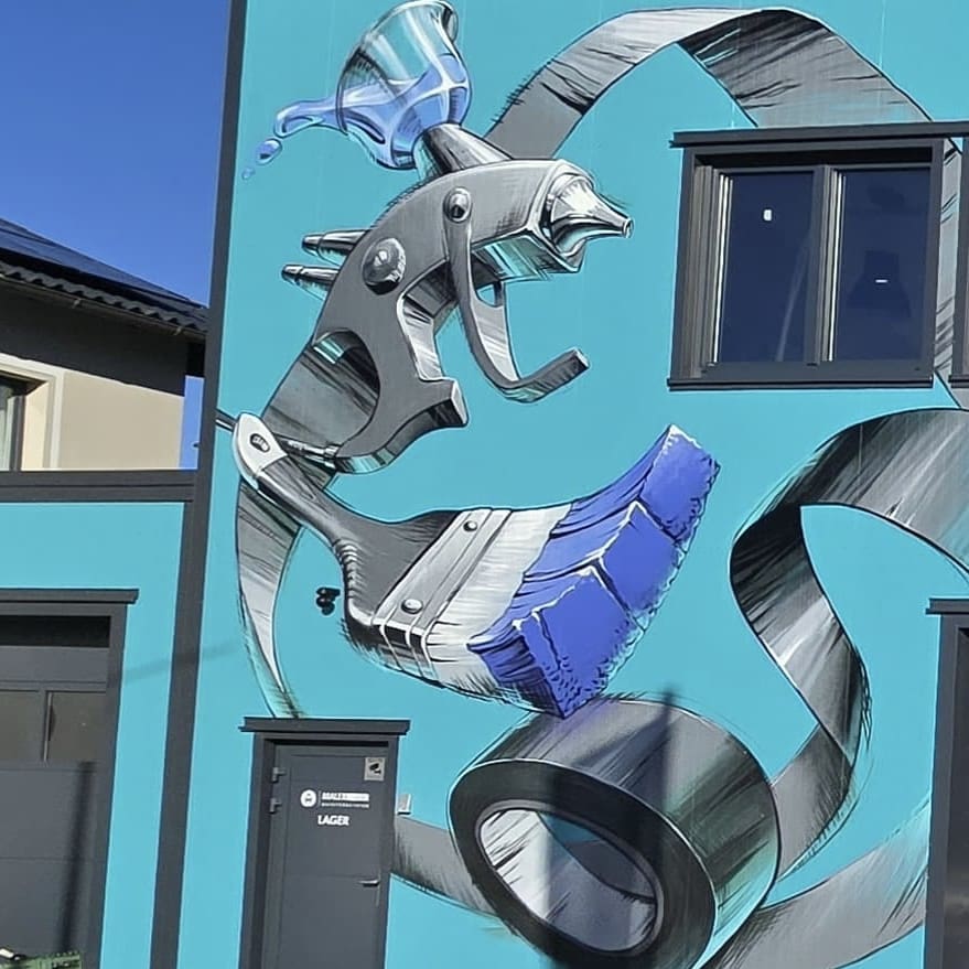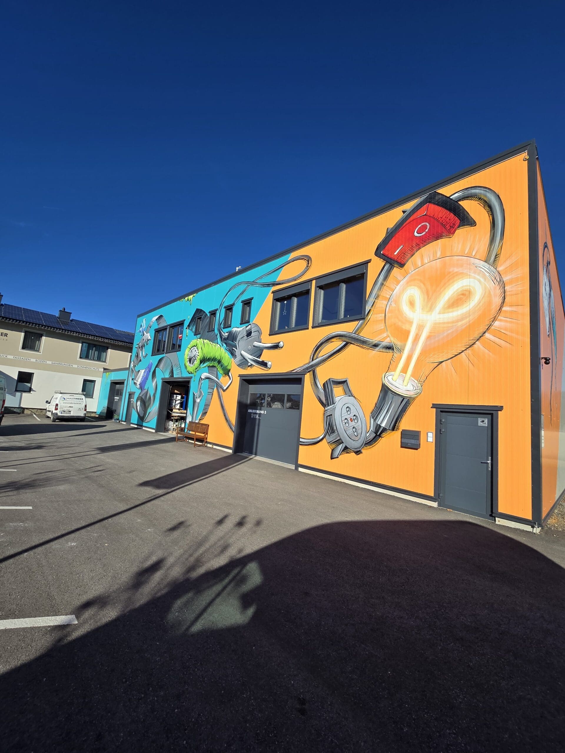 Eine vormals graue Firmenhalle wird mit Graffiti verwandelt. Zunächst wurde die Halle mit kräftigen Untergrundfarben von der Firma Maler Meier vorbereitet, passend zu den jeweiligen Unternehmensfarben des Malers und Elektrikers. Entwürfe und Ideen führten schließlich zum Motiv: Kabel und Klebeband, Glühbirne und Malerwalze schwingen sich nun über die Fläche. Die Werkzeuge und Objekte aus dem Berufsleben sind in dynamischem Comicstil interpretiert und zeigen auf einen Blick, welche Firmen hier ihren Sitz haben. Innovation, Mut und Kreativität wird hier gelebt – und künftig wird hier auch eine Kooperationspartnerschaft entstehen.