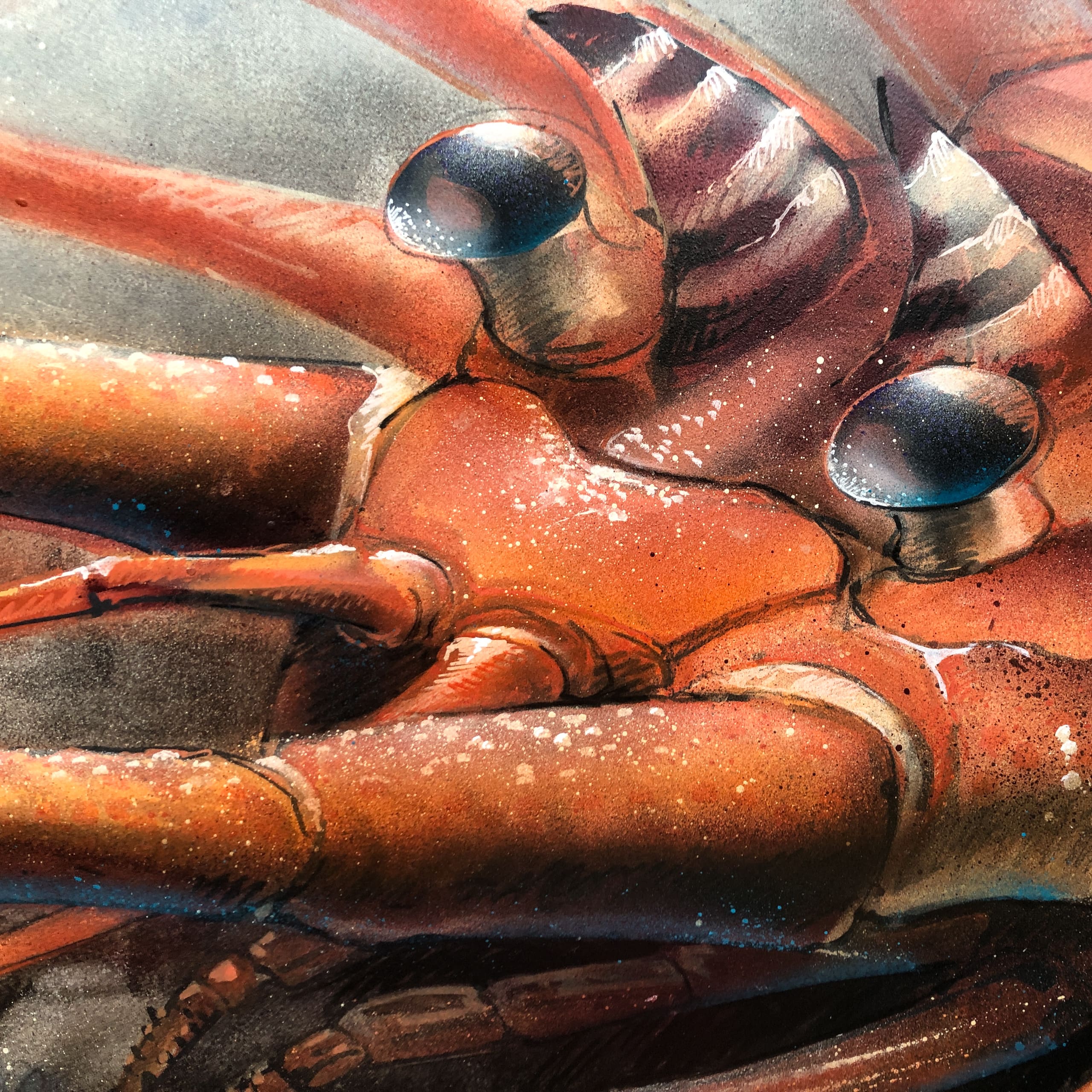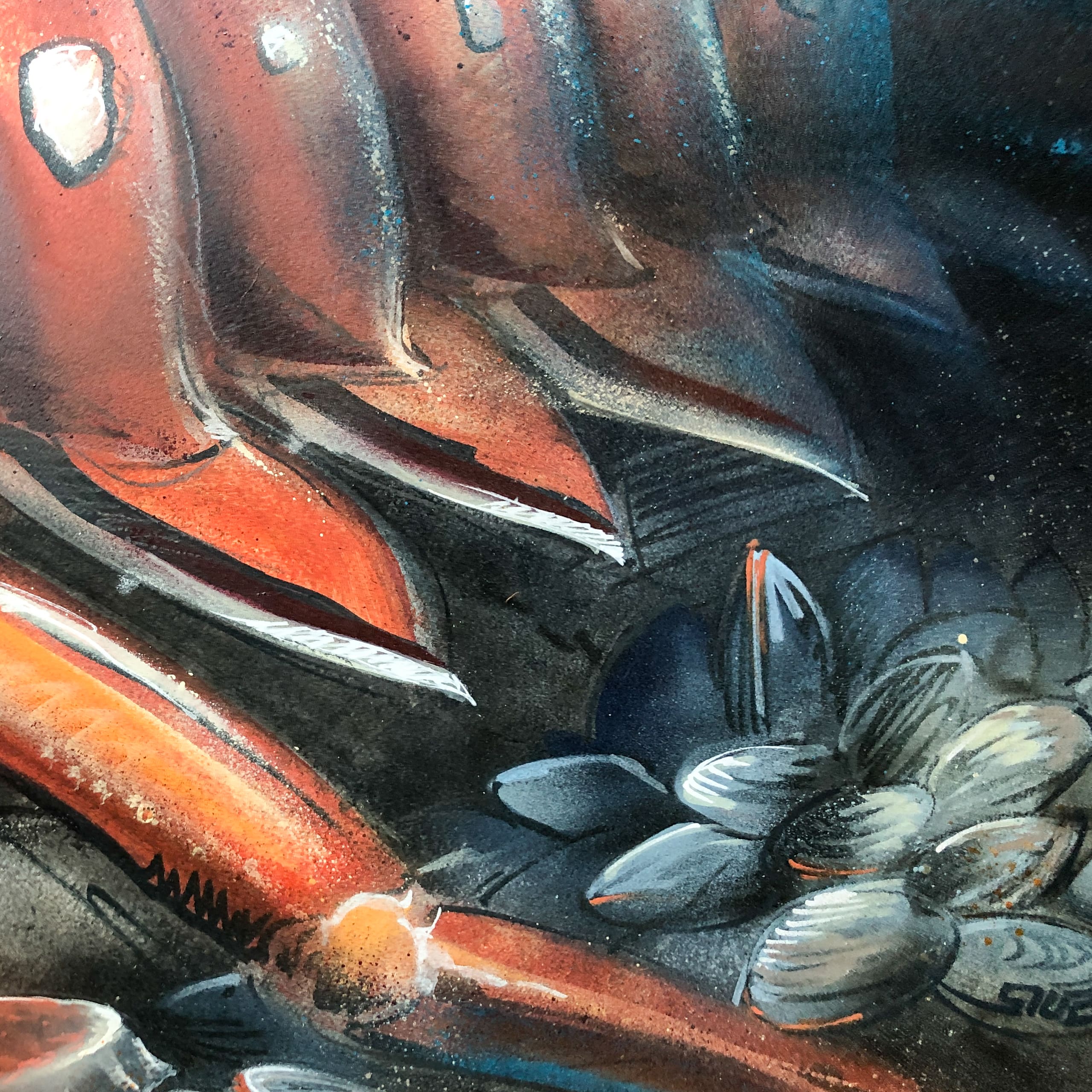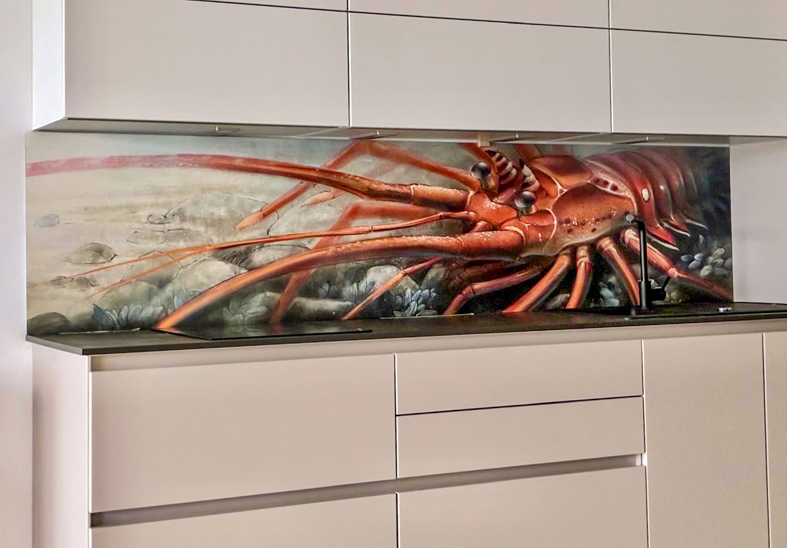 Eine geradlinig und modern eingerichete Wohnung bekommt Pepp; Das Küchenrückwand Design zeigt eine Unterwasserszene mit einer Languste. Bewusst etwas provokant und mutig ist das Tier übergroß dargestellt und streckt seine Beine und Fühler über die gesamte Fläche von 2,5m. Farblich sind Sand und Muscheln mit der Einrichtung abgestimmt, wohingegen das Orange der Languste einen willkommenen Konbtrast setzt. Das Werk stellt zudem schöne Übergänge von der dunklen Arbeitsplatte zu den hellen Küchenfronten her. Ein mutiges und spannendes, handgefertigtes Küchenrückwand Design.