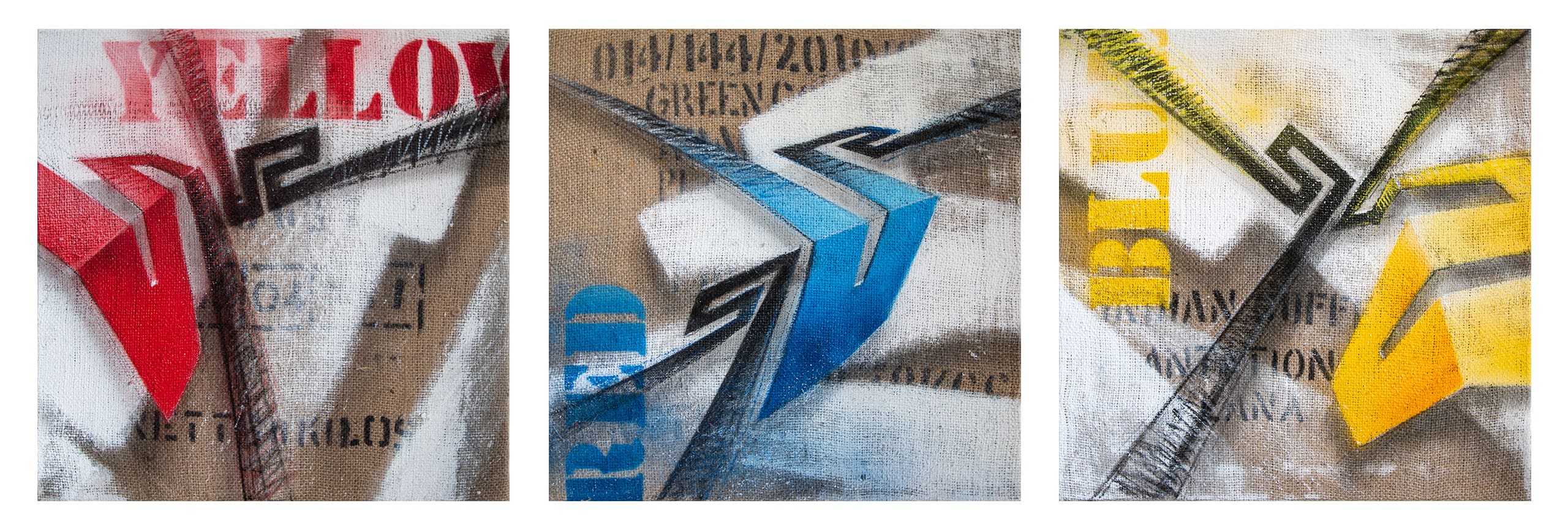 Schablonen sind Ausdrucksformen und wichtige Elemente im Umgang mit der Sprühdose. In der 3-teiligen RGB-Serie dienen Kaffeesäcke aus Jute als Malgrund. Die mittels Schablone aufgetragenen Beschriftungen der Säcke sind rein zweckgebundene Informationen über den Inhalt. Die Zahlen und Worte wirken wie ein Code, den der Laie auf den ersten Blick nicht nachvollziehen kann. Diese Zeichen wurden als Bestandteile des Bildes bewahrt und ergeben ein schönes Gesamtbild mit den neu hinzugefügten, einfachen räumlichen Formen. Als zusätzliches Spiel zum Codeknacken sind die 3 Primärfarben der Serie – Rot, Gelb und Blau – als Worte ebenfalls in Schablonenschrift dargestellt, allerdings in einer jeweils anderen Farbe; Das Wort Yellow wurde Rot gesprüht usw. Das sogenannte „Farben lesen“ ist ein bewährtes Konzentrationsspiel bei dem die Farbe laut benannt wird, nicht aber das Wort gelesen wird. Klingt einfacher als es ist, da unwillkürlich 2 Verarbeitungsprozesse im Gehirn ablaufen. Der Titel birgt das dritte Wortspiel; RGB ist allgemein bekannt für Rot-Grün-Blau als Basis von Farbdarstellungen auf Bildschirmen (Licht, additiv) – hier steht die Abkürzung als Bildtitel für die Primärfarben in der Kunst (Pigmente, subtraktiv). Die Werke sind in ihrer Ausführung einfach gehalten, beinhalten aber umso mehr Aspekte im Inhalt. Sie wirken einzeln positioniert ebenso wie als Dreiteiler.